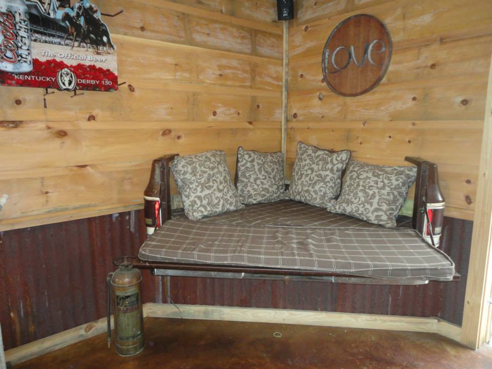 There are Mason jar chandeliers and a seat made from the back of a truck bed: