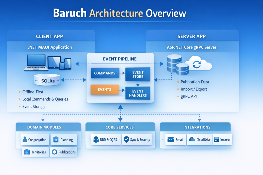 The Architecture Behind Baruch Exploring complexity, design choices, and why it matters When you’ve been working on a software project for a long time, it’s easy to lose sight of its overall structure. Recently, I asked Codex (AI) to analyze and describe the architecture of Baruch. What stood out to me wasn’t just what it described but how much is actually there. This article is a reflection on that: the size, structure, and architectural choices behind Baruch. A Modular System, Not a Single App Baruch is a multi-project .NET 10 solution, built around clearly defined modules. Each module represents a specific domain or responsibility: Congregation Planner Publisher Territories Publications Statistics Disaster Preparedness These are bounded contexts, each with their own: domain models commands and queries repositories DTOs and mappers This separation keeps the system maintainable as it grows. Client and Server Baruch consists of two main runtime environments: Desktop / Mobile Application The main application (AgapeApps.Baruch) is built with .NET MAUI. It handles: UI and views local data storage (SQLite) domain logic synchronization user interaction Everything is composed in a modular way through MauiProgram.cs, where services, views, logging, and configuration are wired together. Server (gRPC) The server (AgapeApps.Baruch.Server) is an ASP.NET Core gRPC service. It is responsible for: publications and external data import processes SQL Server persistence This creates a clear boundary: Local-first application, with selective server integration A Pattern-Driven Core At the heart of Baruch lies a consistent architectural approach based on: DDD (Domain-Driven Design) CQRS (Command Query Responsibility Segregation) MediatR for dispatching Instead of calling services directly, the system works like this: A command or query is created It is sent through IMediator A handler processes it The handler updates state, queries data, or emits events This keeps the system: loosely coupled testable predictable Local-First Persistence Baruch is designed as a local-first application. On the client: SQLite is used for storage repositories handle data access databases are created dynamically This allows: offline usage fast performance full control over data On the server: SQL Server is used accessed via lightweight repositories The Event Pipeline (Outbox Pattern) One of the more interesting parts of the system is its event pipeline. Instead of directly mutating state everywhere, Baruch uses an outbox pattern: A command is executed Instead of applying changes directly, it can generate an event The event is stored locally A processor reads events later Events are turned back into commands and executed In simple terms: Commands can become events — and events can become commands again This enables: reliable synchronization eventual consistency decoupled processing Integration as Sidecars External integrations are intentionally kept separate: Import / Export Email Google Drive Publications importer These are not part of the core app, they are sidecar projects. This prevents external dependencies from polluting the core domain. Why This Matters At first glance, Baruch might look like a typical planning application. But under the hood, it is something different: Built as a distributed system from day one Designed for offline-first usage Structured around clear domain boundaries Using event-driven patterns for synchronization This is not an evolution of an older desktop model. It is a system designed for today’s environment: multiple devices mobile usage synchronization challenges privacy considerations Big Picture Seeing the architecture described from the outside was a helpful moment. It confirmed something I’ve experienced while building: The complexity is real, but it is intentional. Baruch is trying to be reliable, maintainable, and future-proof. And that requires structure. -